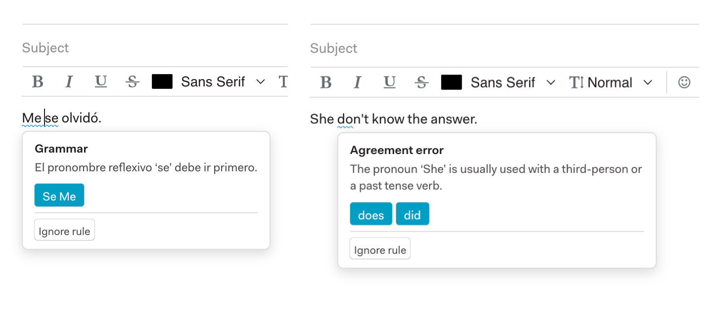 Grammar check automatically detects the language you're writing in, so it works seamlessly whether you write in English, French, German, Spanish, or dozens of other languages.